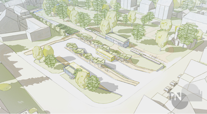 Ein Zankapfel: Der neue Zentrale Omnibus Bahnhof auf der Fläche des heutigen Rosengärtchens. Links die Adelheidstraße, rechts die Klosterstraße (Stadt-Galerie). Die Tiefgarage darunter ist aus der Vogelperspektive unsichtbar. Visualisierung Stadt/Herzig Architekten