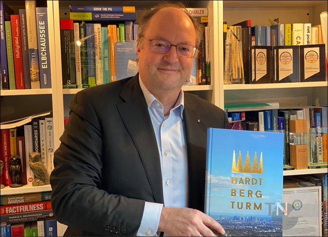 Christoph Klein, 2. Vorsitzender Förderverein Hardtbergturm e.V., präsentiert das hochwertige Buch mit Geschichten rund um das Projekt „Hardtbergturm“. Foto: Scholl