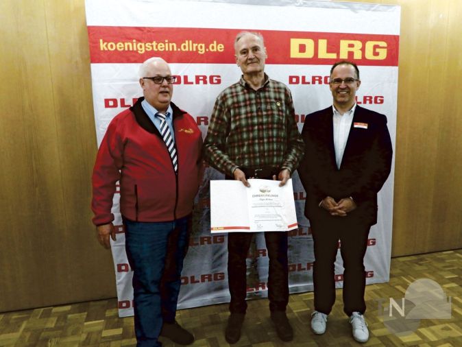 Die Versammlung endete mit der Ehrung von Mitgliedern für ihre jahrelange Unterstützung. Insgesamt zwanzig Mitglieder wurden für ihre 10-jährige Mitgliedschaft geehrt, Altay Bedrettin wurde für 25-jährige Mitgliedschaft ausgezeichnet. Die im letzten Jahr verstorbene Jutta Kraft wäre an diesem Tag für ihre 50-jährige Mitgliedschaft ausgezeichnet worden. Adrian Klinger wurde für die Übernahme von überdurchschnittlich vielen Wachdiensten ausgezeichnet. Für 40-jährige Vereinstreue wurden jeweils Dr. Doris Borchmeyer-Lehmann, Werner Noll, Andreas Mühlbauer und Jürgen Wichmann geehrt. Auf Letzteren wartete noch eine Überraschung. Wichmann erhielt das Verdienstzeichen in Gold mit Brillant – die höchste Auszeichnung der DLRG. Seit dem 13. März 1985 ist Jürgen Wichmann als Kassenwart für die Ortsgruppe Königstein tätig. Er trug erheblich zu deren Rettung bei, da diese damals kurz vor der Auflösung stand. Seitdem konnte die Mitgliederzahl von 90 auf über 300 erhöht werden. Neben der jahrzehntelangen verantwortungsvollen Führung der Vereinsfinanzen modernisierte Wichmann die Verwaltung durch die Umstellung von Karteikarten auf elektronische Kassenführung und den Aufbau einer digitalen Mitgliederverwaltung. Das System hatte er damals selbst programmiert. Zusätzlich engagierte er sich als Übungsleiter und als Ansprechpartner für Satzungs- und Vereinsrechtsfragen. Das Verdienstzeichen wurde dem überraschten Jürgen Wichmann vom Vizepräsidenten des Landesverbandes der DLRG, Jens Hunsche, und dem Bezirksleiter, Ferdinand Steinsberger, überreicht. „Diese Auszeichnung ist sehr selten bei der DLRG“, erklärte Hunsche. Zusätzlich bekam Wichmann einen ansprechenden Präsentkorb und einen Blumenstrauß für die Gattin. „Ich bedanke mich ganz herzlich“, so Jürgen Wichmann sichtlich gerührt.