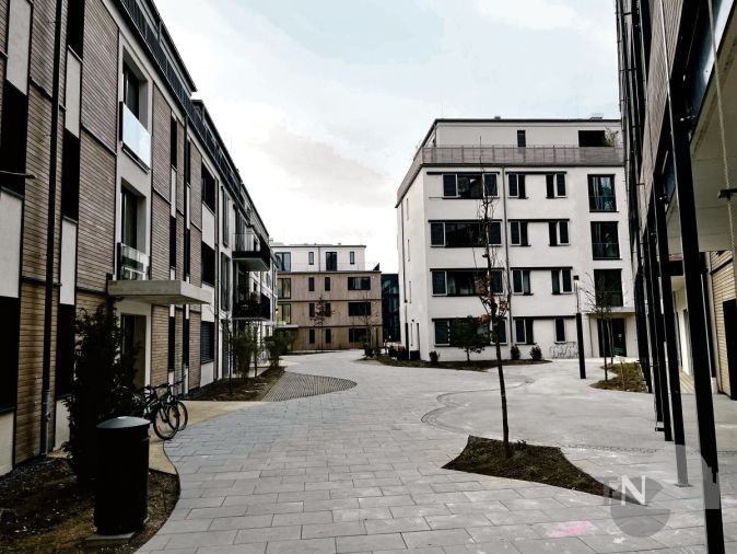 Die meisten gewerblichen Räume im – vom Haus der Begegnung gesehen – hintersten Gebäude „Haus G“, in dem sich auch die neue Kita „Lila Launehof“ befindet, sind bezogen. Vermietet sind sie laut Eberhard Horn Real Estates alle. Aber auch an den Wohnhäusern rund um den großen Innenhof finden sich immer mehr Namensschilder an den Klingelanlagen. 80 Prozent der Wohnungen seien bereits vermietet, bestätigt Jana Horn, die mit Eberhard Horn Real Estates auch die Wohnungsvermietung von Quantum übernommen hat.