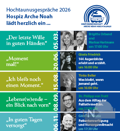 Königstein (kw) – Zum dritten Mal bietet die Hospizgemeinschaft Arche Noah Hochtaunus die Hochtaunusgespräche für Interessierte an. Wie in den Vorjahren gibt es auch diesmal spannende Themen. Über Lesungen, Vorträge und guten Austausch bietet das Hospiz mit diesem Rahmenprogramm einen interessanten und wertvollen Beitrag zur Gesellschaft. Das Thema Tod und Trauer, aber auch Vorsorge sowie lyrische Angebote werden vielfältig angeboten.
