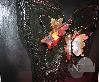 „Ich möchte mit meinen Bildern die Menschen erfreuen, dafür male ich. Und im Idealfall können sie sich selbst in dem wiederfinden, was ich da auf die Leinwand bringe.“ Was sie auf die Leinwand bringt, ist manchmal golden und manchmal schwarz, mal flach und mal erhaben: Ihr Schmetterling erhebt sich vom Bild, wenn Rieger Malen und Gestalten kombiniert, verschiedene Schichten Metall hat sie für die Schmetterlingsflügel verwendet. Oft konzentriert sie sich auf eine Handvoll Farben, wilde Farbexplosionen wie die von Callen Schaub sind offenbar nicht ihr Metier, weniger ist bei Marie-Luise Rieger mehr.