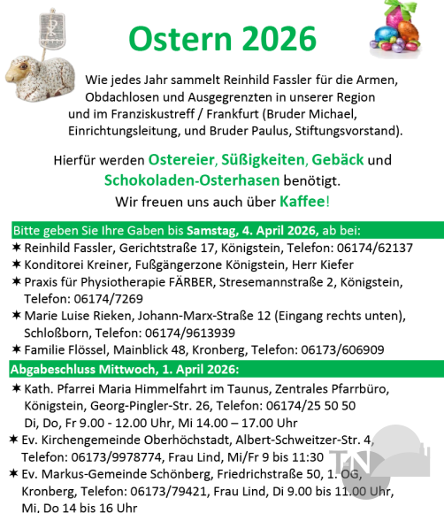 Interessierte werden gebeten, bis Samstag, 4. April, ihre Spenden bei Reinhild Fassler, Gerichtstraße 17, in Königstein abzugeben. Sie ist ebenfalls unter 06174 62137 zu erreichen. Weitere Abgabeorte sind: