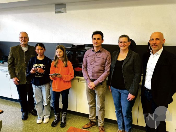 Im sogenannten Makerspace der St. Angela-Schule, dort, wo die jungen Tüftlerinnen und womöglich angehenden Ingenieurinnen sich erproben, steht seit Dezember ein neuer, hochmoderner 3D-Drucker des Herstellers Prusa neben drei älteren Modellen. Der große Vorteil: Das rund 1.600 Euro teure Gerät – das mit dem Glasgehäuse zur Vermeidung von thermischen Einflüssen auf den drahtförmigen Werkstoff fast schon eine High-Tech-Anmutung hat und dadurch noch viel teurer aussieht – ist superschnell. Es druckt etwa doppelt so schnell wie die vorhandenen Geräte, erklärt MINT-Lehrer Martin Bergener bei der offiziellen Übergabe des Druckers durch Prof. Winfried Hofmann, der gemeinsam mit seiner Frau Helga der Königsteiner Stiftung vorsitzt und die Spende ermöglichte. Also quasi Formel 1 gegenüber Golf-Klasse – und schon wieder ein Modelljahr aktueller als jener Drucker, der im vergangenen Jahr an die Bischof-Neumann-Schule gespendet wurde, wie Hofmann ausführte.