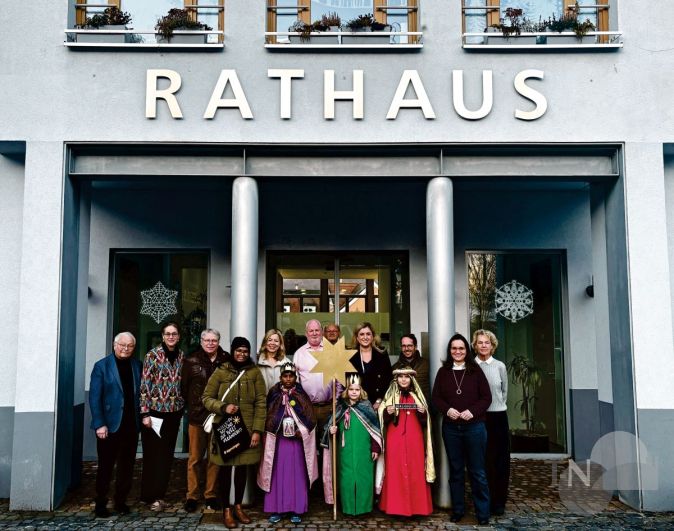 Bürgermeisterin Beatrice Schenk-Motzko, die Magistratsmitglieder und Rathausmitarbeitende empfingen die Kinder, die als Heilige Drei Könige „Caspar“, „Melchior“ und „Balthasar“ aus der Weihnachtsgeschichte unterwegs waren, und freuten sich über den Segensspruch für das Haus.