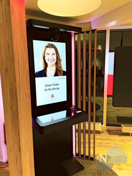 Die Dialog Lounge ist eine Weiterentwicklung der Dialog Insel, der Kunden beim Betreten der Filiale direkt begegnen. Dieses Terminal, ausgestattet mit moderner Technik und eingerahmt durch eine optisch ansprechende Holzverkleidung, ist allerdings offen und nicht auf Diskretion ausgerichtet. Es ist eine Eigenentwicklung der Sparkasse, eingeführt im Jahr 2022 und mittlerweile an allen modernisierten Standorten anzutreffen – und akzeptiert. Ausgerüstet mit Kamera, Monitor und Touchscreen können sich Kunden durch Auflegen ihrer Bankkarte identifizieren und selbstständig mit einem Berater in der Zentrale in Kontakt treten, etwa bei Fragen zum Online-Banking, bei Servicefragen oder zum Entsperren der Karte.