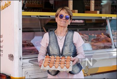Christa Justus verkauft Eier und Geflügel auf dem Wochenmarkt.