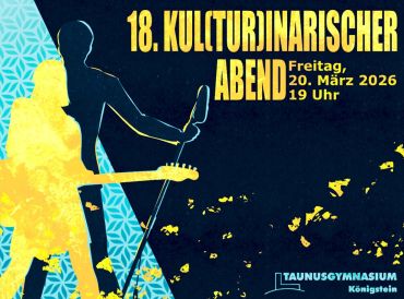 Königstein (kw) – Das Taunusgymnasium Königstein lädt ein zum 18. Kul(tur)inarischen Abend am Freitag, 20. März, um 19 Uhr im Theaterraum. Bereits eine halbe Stunde früher beginnt der Abend bei einem Glas Sekt im Foyer.