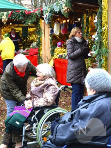 Köstliche Düfte lockten die Bewohner, Angehörigen und Freunde des Seniorenstifts Kronthal hinaus in den Sinnesgarten. Dort hatte das engagierte Team des Seniorenstifts viele kleine Weihnachtsbuden im Kreis aufgestellt und diese liebevoll mit Goldpapier und Tannengrün geschmückt. Darin duftete es verführerisch nach Kartoffelpuffern und Pilzpfanne, Forellen und Lauchsuppe, aber auch nach Waffeln, Gebäck, Stollen und Glühwein. Eine ganz besondere Überraschung hatte die Pflegedienstleitung, Maria Klinka sich ausgedacht. Sie hatte die Schafwolle vom hauseigenen Schaf „Janosch“ genutzt, um daraus einen weihnachtlichen Bilderrahmen und auch Adventskränze zu gestalten. Des Weiteren hatten Bewohner in der Beschäftsigungstherapiel fleißig Mützen gestrickt und gefilzt – unter andererem wurde auch die hauseigene Schafwolle dabei verwendet, sodass der Heimbeirat neben Keksen und Marmeladen, Mützen, Windlichter mit Filz ummantelte Teelichter zum Verkauf anbieten konnte. Zur Freude der Bewohner erklangen von der Dachterrasse weihnachtliche Weisen, gespielt vom Bläserorchester Kelkheim. Auch der Männergesangverein 1860 Kronberg erfüllte die Weihnachtsmarktbesucher mit ihren Stimmen. „Wir freuen uns sehr, dass sie uns mit ihrem Auftritt hier seit vielen Jahren die Treue halten“, betonte die Assistenz des Bereichsleiters, Frank Egerer. Die gemütliche weihnachtliche Atmosphäre riefen bei vielen Heimbewohnern Erinnerungen an längst vergangene Zeiten wach. Die 101-jährige Bewohnerin, Irene Prinz, die die Kronthaler Weihnachtsmarktspezialität – warmer „Julischka“ – sichtlich genoss, erklärte „Jetzt ist mir gleich wärmer, aber auf einem Bein steht man nicht so gut!“