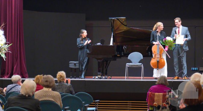 Den Abschluss des Preisträgerkonzerts bildete die Sonate Nr. 3 A-Dur für Violoncello und Klavier op. 69 von Ludwig van Beethoven. Sie gilt als seine monumentalste Cellosonate und entstand in den Jahren 1807 und 1908 während seiner Arbeit an der Fünften und Sechsten Sinfonie. In diesem Werk konnten sich die beiden Musikerinnen noch einmal mit all ihren wunder- und wandelbaren Fähigkeiten präsentieren. Ihr ebenso anrührender wie spannungsgeladener Dialog im Scherzo, in dem das Cello dem Klavier gleichsam zarte Fragen stellt, um im nächsten Moment wieder kraftvoll zum Hauptmotiv zurückzukehren, wird wegen der mitreißenden Interpretation der beiden Künstlerinnen noch lange in Erinnerung bleiben.