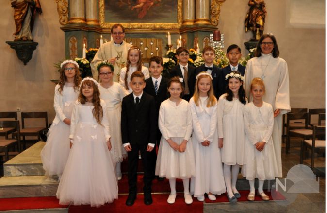 Als feierlichen Höhepunkt der Vorbereitung durften die Kinder in einem Festgottesdienst unter der Leitung von Kaplan Blechschmidt und der Gemeindereferentin Elisabeth Buddeus-Steiff die heilige Kommunion empfangen. Der Festgottesdienst begann mit einer mehrsprachigen Begrüßung in deutsch, französisch und schwedisch durch die Kinder. Die Bemerkung durch Kaplan Blechschmidt, das sei wie bei der Sendung mit der Maus, lockte den Gottesdienstbesuchern gleich zu Beginn ein Lächeln auf die Lippen. Zur festlichen und freudigen Stimmung trug zudem der extra dafür ins Leben gerufene Projektchor unter der Leitung von Elsbeth Raczek bei. Als Höhepunkt des Festgottesdienstes durften folgende Kinder die erste heilige Kommunion empfangen: Leonhard Alsheimer, Philip Choi, Elisa Cors, Luca di Lorenzo, Elisabeth Görlach, Felix Homberg, Anna Maria Mai, Helena Nyqvist, Laura Siedenbiedel, Dominika Szymanska, Julia Szymanska, Julius Uhde, Tom Vohwinkel und Nele Zweifel.
