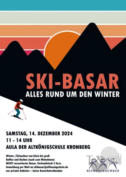Kornberg (kb) – Nach dem großen Zuspruch im Vorjahr findet auch in diesem Dezember wieder ein Ski-Basar in der Kronberger Altkönigschule statt: Am Samstag, 14. Dezember, gibt es von 11 bis 14 Uhr wieder alles rund um den Winter. Neben Skijacken, langen Unterhosen und Skistiefeln können auch kuschelige Winterklamotten für den Alltag verkauft und gekauft werden. Ab sofort können interessierte Verkäufer für 5 Euro Standgebühr einen Tisch buchen – ganz unkompliziert per E-Mail an skibasar[at]altkoenigschule[dot]de.