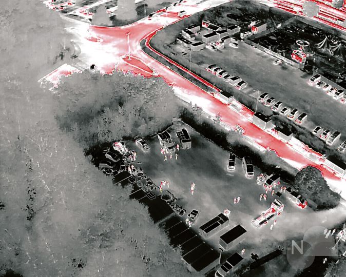 Die Wärmebilddrohne zeigt die Einsatzfahrzeuge der Feuerwehren des Hochtaunuskreises, auf die bei einem Waldbrand zurückgegriffen werden kann.Fotos: HTK