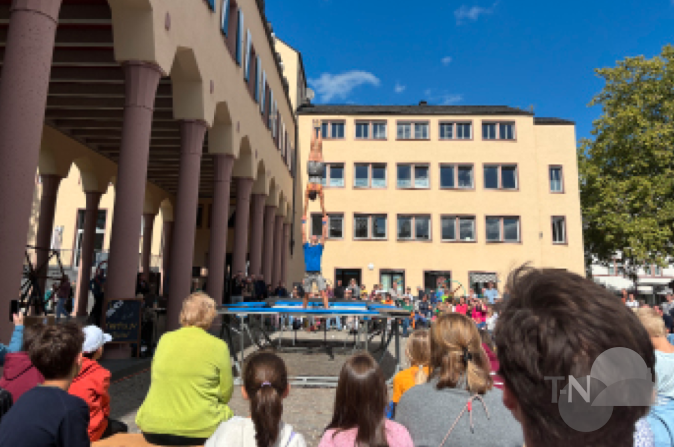 Kronberg (ivy) – Eine Menschenmenge auf dem Berliner Platz, ein Raunen geht durch die Zuschauer und viele gebannte Kinderaugen sind auf ein großes Trampolin in der Mitte gerichtet. Darauf springen ein Mann und eine Frau immer wieder gemeinsam in atemberaubende Höhe und zeigen akrobatische Figuren. Dabei gelingt es ihnen nicht nur durch die Akrobatik für Faszination und Beifall zu sorgen, sondern sie erzählen zusätzlich eine Geschichte. Mit viel Humor und ihrer vollständig aufeinander eingespielten Art schaffen sie es auf bemerkenswerte Art und Weise diese heitere Stimmung auf das Publikum zu übertragen und für Staunen aber gleichzeitig auch Lachen zu sorgen. Das artistische Duo „Aramelo“ mit ihrer Trampolinshow „(Un)folded“ zählte lediglich zu einem von vielen unterschiedlichen Programmpunkten des neuen Veranstaltungsformats „Rendezvous in Kronberg“, das am vergangenen Sonntag seine Premiere in der Burgstadt feierte. Von 11 bis 18 Uhr gab es von Ausstellungen und Konzerten über Führungen zur Stadtgeschichte sowie Lesungen eine große Auswahl. Wer sich vom Berliner Platz ausgehend durch die Gassen der Altstadt auf den Weg zur Burg machte konnte viele Überraschungen entdecken.