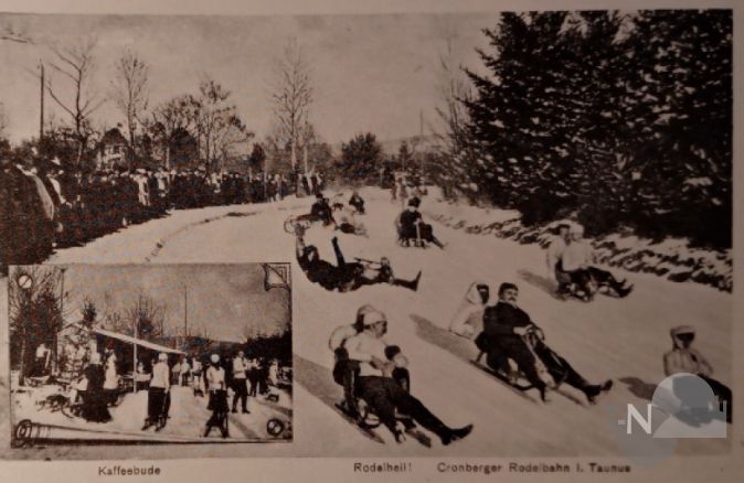 August Wiederspahn (1892-1972) hält in seinen als Buch publizierten Memoiren „Jugendtage im alten Kronberg“ fest, dass zu seiner Schulzeit um 1900 in der kalten Jahreszeit oft sechs Wochen lang Schlittenfahren ohne Unterbrechung täglich, manchmal sogar bis Mitternacht, angesagt war. Dann war Alt und Jung sowie Mann und Frau auf den Beinen oder besser gesagt auf den Rodeln. Damit sind wir schon beim eigentlichen Thema dieses Artikels angelangt – dem Rodelsport in Kronberg. Heute kaum mehr vorstellbar, dass bis in die 1950er Jahre jedes Wochenende bei guten Schneeverhältnissen abertausende Rodelbegeisterte beiderlei Geschlechts mit dem Zug und Auto aus Frankfurt in die allseits gerühmte Rodelhochburg Kronberg kamen, um hier ihrem Sport auf flinken Schlittenkufen zu frönen. Wiederspahn geht von bis 30 000 Personen aus. Wem es von diesen zu beschwerlich war, einen Schlitten mitzuschleppen, der konnte sich praktischerweise einen solchen in der Burgstadt ausleihen.