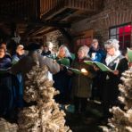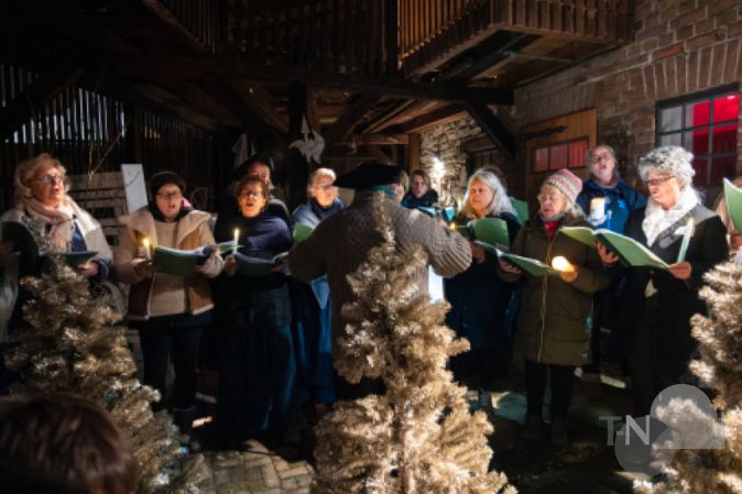 Begonnen wurde die Führung im Hof der Dingeldein Kulturscheune. Mit dem eingedeutschten Kärtner Lied „Zünd ein Licht für Dich an“ brachte der Chor mit nach und nach angehenden Kerzen eine zauberschöne Stimmung in den Hof. Fast gestört wurde das Idyll durch einen jungen Mann der bei Fräulein Elsbeth Dingeldein (Isabelle Böddinghaus) als Schreiner eine Arbeit finden wollte. Dieser wurde trotz guter Argumente vom Hof gejagt.