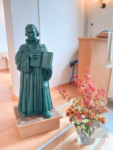 Mit Treffsicherheit, Witz und Klarheit ging der Lutherinterpret Klaus Flössel auf Fragen des Atempause-Teams ein. Zitate aus seinen vielfältigen Schriften zu den Themen „Glaube/Mammon/falsche Götter“, „Vernunft statt Gewalt“ und „Kraft des Gebets“, ebenso wie die Lieder, zeigten die Aktualität des Reformators bis heute. Die Gottesdienstgemeinde genoss zudem die schöne Musik von Tobias Witzlau, der mit Cister, Laute und Barockflöte den Gottesdienst begleitete und mit Liedern Luthers passend untermalte, und sparte nicht mit Lob. Im Kirchraum waren Originalschriften Luthers zu begutachten – faksimilierte Bücher –, und die Besucher konnten sich an leckerem Luther-Brot und heißem Apfelwein laben. Es war ein gelungener Auftakt für das Reformationsfest am 31. Oktober.