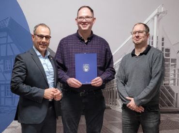 Anfang Februar übergab Bürgermeister Adnan Shaikh (links) die Urkunde, mit der Nils Hoffmann (Mitte) zum Leiter für das Sachgebiet Bauverwaltung, Freiraum und Landschaft im Eschborner Rathaus ernannt wurde. Das Sachgebiet ist in den Fachbereich Planen und Bauen eingegliedert, das von Alexander Schilling (rechts) geleitet wird. Nils Hoffmann war bereits zuvor in der Bauverwaltung für die Stadt Eschborn tätig.Foto: Stadt Eschborn