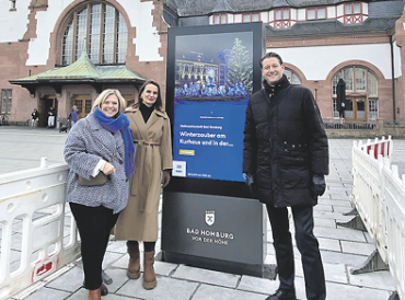 Bad Homburg (hw). Wer künftig in der Bad Homburger Innenstadt oder am Bahnhof ankommt, kann sich an „Ort und Stele“ direkt über allerhand touristische Angebote in der Kurstadt informieren. Mit der Einrichtung von zwei digitalen Info-Stelen setzt die Stadt das nächste Projekt in puncto Smart City um. An zwei zentralen Plätzen im Stadtgebiet – am Kurhaus und auf dem Bahnhofsvorplatz – versorgen nun moderne Anzeigetafeln die Passanten mit vielfältigen Informationen.