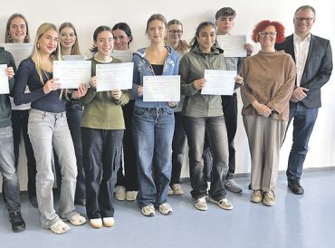 Oberursel (ow). Am Donnerstag, 30. Oktober, überreichte Dr. Ulrike Ruttmann, Fachsprecherin Französisch, in einer kleinen Feierstunde am Gymnasium Oberursel die DELF-Diplome des Schuljahren 2024/25 an die zwölf erfolgreichen Absolventen. Zusammen mit Schulleiter Philipp Schefzyk und Friederike Pitsch, Leiterin des Fachbereichs I am GO, würdigte sie die Leistungen der Schülerinnen und Schüler. Die Diplome, die vom französischen Bildungsministerium ausgestellt werden, sind Unikate und werden extra in der französischen Bundesdruckerei erstellt.