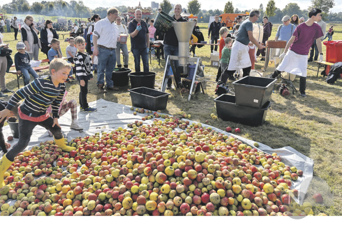 Zum zehnjährigen Jubiläum gab es 1,5 Tonne Äpfel, die zu 800 Liter Apfelsaft verarbeitet wurden getreu dem Motto: auf die Plätze, fertig, los...