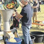 Benjamin Müller befüllt den Trichter, damit anschließend die Äpfel zerkleinert werden können.Foto: sis