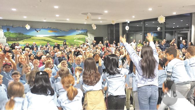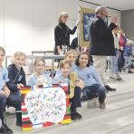 Der Mann mit dem Hammer, Frank Dastych heißt er und zwei Kinder von ihm bieten in der ersten Reihe mit, gibt sein Bestes bei seiner Premiere als Auktionator im anhaltenden Gewusel. Der Schulchor in hellblauen Shirts mit Logo vorne und Name auf dem Rücken hat unter der Regie von Musikschulleiter Holger Pusinelli am Klavier für eine schöne Einstimmung gesorgt, Konrektorin Nadine Schwarz die Gäste begrüßt, die Versteigerung kann beginnen. Das Kalenderbild der 3a für den Monat Februar wird an der Schauwand platziert, damit die Leute im Saal auch wissen, für was sie hier mitbieten können. „Wir sind alle verschieden, aber wir gehören alle zusammen“, hat die 3a als Motto für ihr buntes Gewimmel gewählt, in Fünf-Euro-Schritten geht es schnell voran, nach gar nicht langer Zeit und Animation von Frank Dastych fällt der Hammer „zum Ersten, zum Zweiten und zum Dritten“ bei glatten 100 Euro, die 3a hat ihr Bild gemeinsam selbst ersteigert.