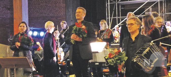 Mit ihrer wunderschönen Stimme, lyrisch zart aber auch kraftvoll schwebte Alexandra Timofeeva förmlich über dem Chorgesang beim „Benedictus“. Die mehrfach ausgezeichnete Solistin ist Gesangslehrerin an der Musikschule und verzauberte das Publikum mit der ganzen Bandbreite ihrer Stimme von Sopran bis Mezzosopran. Als wahrer Könner agierte Bandoneon-Spieler Norbert Kotzan. Mit Hingabe und Leidenschaft stellte er das gerade beim Agnus Dei (Lamm Gottes) und der abschließenden Bitte um Frieden – dona nobis pacem - meisterlich unter Beweis. Das Bandoneon in Deutschland erfunden, fand seinen Weg nach Südamerika und gilt als typisches Tango-Instrument.