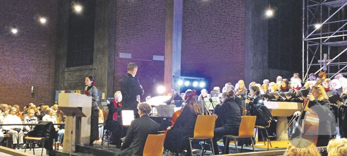 Oberursel (bg). Nach der beeindruckenden Aufführung von „One World“ im vergangenen Jahr brachte die Musikhochschule Oberursel mit „Misatango“ wieder ein außergewöhnliches Werk zur Aufführung, das viele Besucher anlockte. Die Liebfrauenkirche war gut gefüllt. Sie wurde in 1960er Jahren erbaut und steht seit 1965 unter Denkmalschutz. Der Innenraum ist weit und offen gestaltet, mit Sitzbänken in U-Form rund um den Altar. Ein besonderes Wahrzeichen neben der großen Madonnenfigur aus Lindenholz von Georg Hieronymi ist die Klais-Orgel. Eine der bedeutendsten Orgeln im Rhein-Main-Gebiet. Sie wird gerade renoviert, viele Orgelpfeifen und Verbindungsteile lagerten auf Sitzbänken. Insgesamt bietet die katholische Kirche mit dem ungewöhnlichen Grundriss eines gleicharmigen Kreuzes Platz für 800 Besucher.