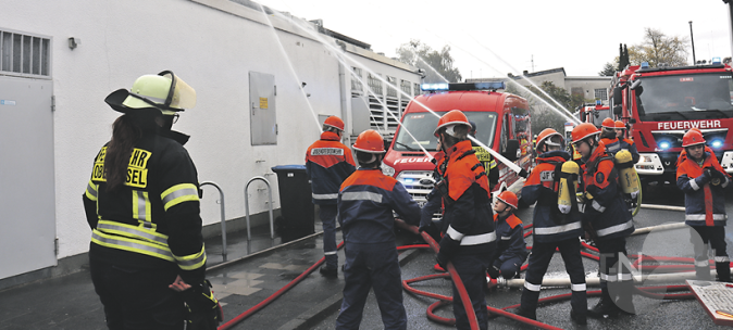 Die Jugendfeuerwehren aus Oberursel sorgten dafür, dass der „Brand“ sich nicht auf umliegende Gebäude ausbreiten konnte.Foto: gt