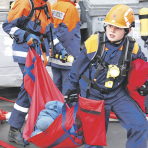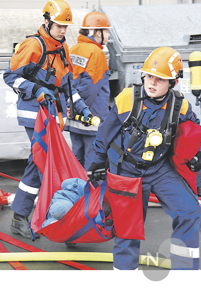 So lautete die Meldung, die die Jugendfeuerwehren aus Oberursel und Steinbach erhielten, als sie gegen 15 Uhr alarmiert wurden. Kurz danach waren die Martinshörner deutlich hörbar und nach nur fünf Minuten trafen die Jugendlichen aus Steinbach am Einsatzort ein. Bereits als sie aus den Fahrzeugen aussteigen, trugen manche von ihnen Atemschutzflaschen. Diese Geräte für die Suchtrupps wurden speziell für die Jugendfeuerwehr angeschafft und sind leichter als die herkömmlichen Geräte der Feuerwehr. Die Attrappen sollen den Jugendlichen helfen, sich daran zu gewöhnen, das Gewicht am Rücken zu haben.