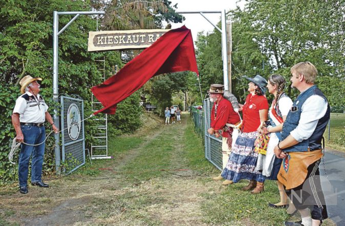 Damit verriet sie also nichts Neues, lud aber die aufmerksam lauschenden Zuhörer ein, die Gruppe zu begleiten, der sich auch Brunnenkönigin Pia I. und Brunnenmeister Mathias anschlossen, um mit ihnen gemeinsam zum Eingang des Grundstücks zu gehen. Was wohl manch einer beim Hereingehen übersehen hatte: Hier hing an zwei „Galgen“ ein in festliches Rot gehülltes Schild, das Horst Becker und Herbert Goldmann durch das Ziehen an zwei langen Seilen enthüllten. Seither verrät der Schriftzug „Kieskaut Ranch“ auf einem mächtigen Holzschild, dass hinter diesem Tor der Bommersheimer Country- und Westernclub sein Zuhause hat. „Es war eine längere Angelegenheit, doch nun stimmt alles“, sagte Martina Hagedorn im Anschluss an den kleinen, festlichen Akt. Immerhin galt es, nicht nur das richtige Holzschild zu finden und den Namen darauf anzubringen, sondern auch die richtige und sicherste Aufhängung dafür zu ersinnen.