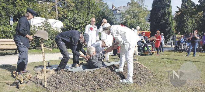 Immer wieder nutzt das Friedensbündnis Oberursel, einmal mehr Veranstalter des Friedenskulturtages zum Ende des „Orscheler Sommer“, das Umfeld des Denkmals für Aktionen und Veranstaltungen, bei dem es um sein Kernanliegen geht. Eine junge Friedenslinde hat das Bündnis 2021 knapp neben das umstrittene Denkmal gepflanzt, andere Plätze im Park erinnern an Aussöhnung und neue Partnerschaften. Alle Jahre wieder pflanzt Gärtner und Bündnismitglied Robert Kommraus vor dem Denkmal Blumenzwiebeln, wenn die Pflanzen aufblühen, formen sie das Peace-Zeichen. Am Sonntag stieg Robert Kommraus in einen Zinksarg und wird später wieder ausgebuddelt. Die Laienspielgruppe des Bündnisses zeigt Berthold Brechts „Legende vom toten Soldaten“ und zieht damit auch reichlich zufällig vorbeikommendes Publikum an. Das gespielte makabre Gedicht vom Soldaten, der den Heldentod für sein Vaterland gestorben ist und trotzdem wieder in den Krieg geschickt werden soll, weil die Militärärzte, die ihn ausbuddeln, für wehrtauglich und bereit für den nächsten Krieg erklären, wird kurzzeitig zum Mittelpunkt des Friedensfestes. Nicht alle Besucher aber können oder wollen die Einbindung in das Stück mittragen, das Volk zu spielen, das in einem grotesken Maskenzug Kaiser und Militär fraglos und bedingungslos mit „Hurra“-Rufen in den nächsten Krieg folgt. Von der „Front“ zum „Jenseits“ sind es nur ein paar Meter, zwei Theater-Schilder zwischen Denkmal für die Toten und der Atlas-Zeder machen das deutlich.