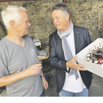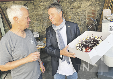 Gratulation des fokus O., vertreten durch Reiner Herrmann (r.), der die Jubiläumstorte an Rüdiger Reul übergibt.Foto: fokus O.