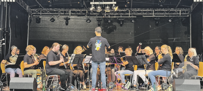Das Blasorchester MGO zum Frühschoppen auf der Bühne am Rathausplatz.Foto: sis