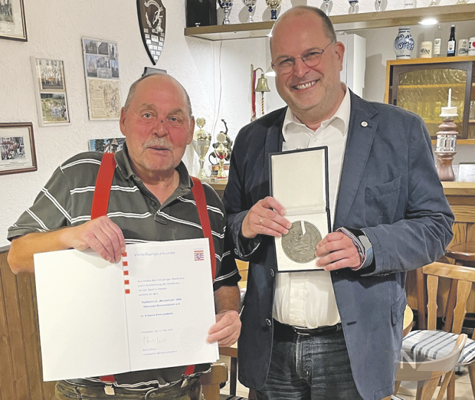 Oberursel (ow). Der hessische Ministerpräsident Boris Rhein hat dem Radfahrclub „Wanderlust“ Oberursel Bommersheim die Silberne Ehrenplakette des Hessischen Ministerpräsidenten verliehen. Mit der Auszeichnung werden aktive Vereine, die 100 Jahre oder älter sind, gewürdigt. Dem Ersten Kreisbeigeordneten Thorsten Schorr war es nun vorbehalten, die Plakette an den Ersten Vorsitzenden des Radfahrclubs, Achim Müller, zu überreichen. Noch heute ist der 98 Mitglieder starke Verein regelmäßig aktiv. Immer montags kommen die Mitglieder von April bis Oktober zum gemeinsamen Radfahren zusammen. Im Clubhaus trifft man sich an jedem ersten Montag eines Monats zum gemütlichen Beisammensein.
