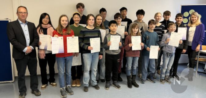 Anschließend übergab sie unter Applaus der Anwesenden die Urkunden der Mathematikolympiade an Anna Lena Engel und Till Weberschock (beide Klasse 5g), Junan Chen (6a), Jack Hullman (6d), Milan Pientka (7g), Fiona Lin (8d), Tabea Bichler (8d), Jasmin Huang (8c), Marc Stühmeier (9c), Ruian Liu (10e), Helene Merzyn (10e) und Dora Mèszáros (Q1). Fiona, Tabea, Jasmin und Ruian haben sich durch die von ihnen erzielten Punktzahlen für die dritte Runde qualifiziert und sind damit auch berechtigt, an einem Vorbereitungsseminar-Wochenende teilzunehmen. Der aus Krankheitsgründen nicht anwesende Victor Glavev (6g) erhält in den nächsten Tagen seine Urkunde über seine Mathematiklehrkraft.