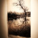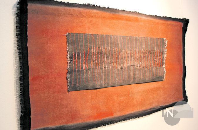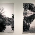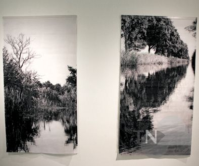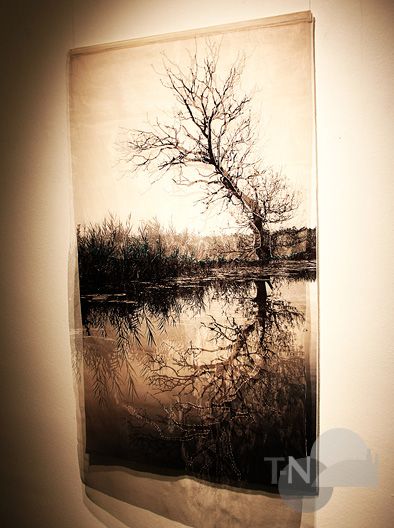 Für manche Ausstellungsstücke verwendet sie auch ihre Fotos, die sie in Postergröße auf transparentem Stoff ausdruckt; und dann eine nahezu deckungsgleiche zweite Schicht darüber stickt.