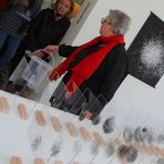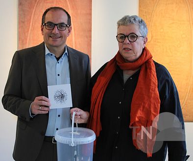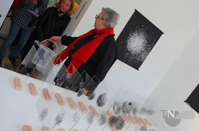Dem Bürgermeister Frank Blasch drückte Helmer beim Infotermin vor der offiziellen Eröffnung spontan einen Eimer in die Hand. Während er mit der Künstlerin durch die verschiedenen Ausstellungsräume ging, wanderte der Stift also hin und her. So machte der Mann (der nach eigener Auskunft eigentlich überhaupt nicht künstlerisch veranlagt ist) mal eben Kunst im Vorbeigehen.