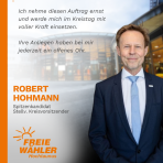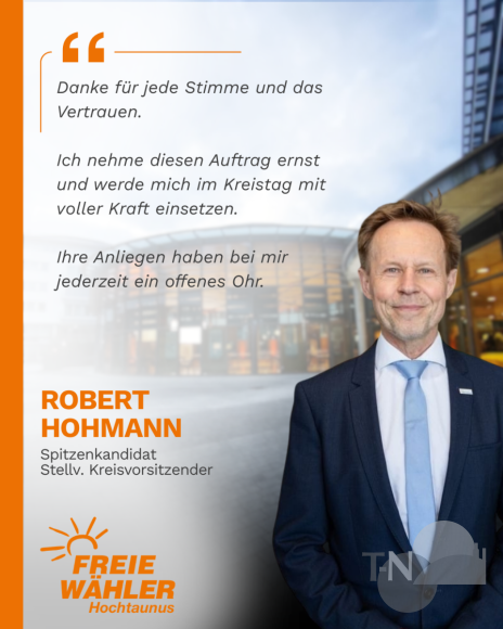 Für die FREIE WÄHLER Hochtaunus wird künftig Robert Hohmann aus Friedrichsdorf das Mandat übernehmen – unser Spitzenkandidat und stellvertretender Kreisvorsitzender. Er steht für eine Politik, die nah an den Menschen ist, verlässlich arbeitet und klare Positionen vertritt.