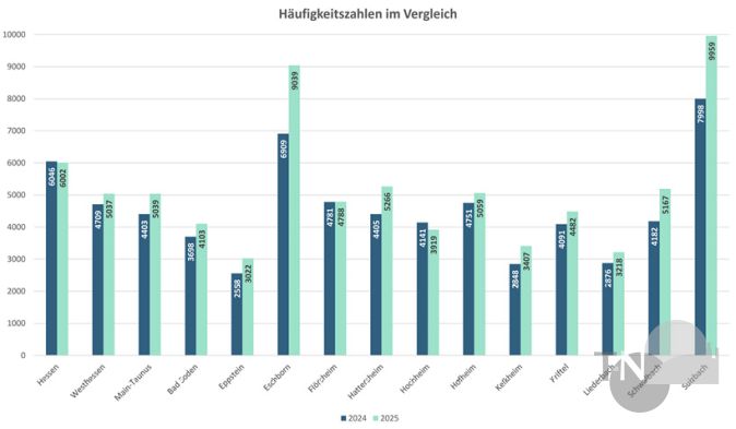 Mit einem Wert von 9.039 kommt Eschborn mittlerweile beinahe an Sulzbach heran. Gegenüber 2024 war das eine Steigerung um 30 Prozent. Dabei wurden die schon 2024 hohen Werte seinerzeit mit statistischen Bereinigungen begründet. Auch Schwalbach weist eine um mehr als 20 Prozent höhere Häufigkeitszahl auf und steht nun bei 5.167. Kelkheim und Bad Soden verzeichneten dagegen nur leichte Steigerungen. Bis auf Sulzbach und Eschborn liegen alle Main-Taunus-Kommunen unter dem hessischen Durchschnitt von 6.002 Straftaten je 100.000 Einwohner.