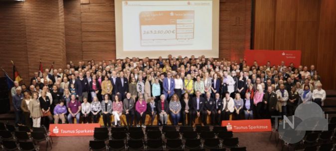 Landrat Michael Cyriax und Oliver Klink von der Taunus Sparkasse übergaben Spenden der Taunus Sparkasse, der Gemeinnützigen Stiftung und der Stiftung „Kinder Lachen“. Insgesamt gingen 263.250 Euro an 164 Vereine und Initiativen. „Dieser Abend ist auch eine Würdigung Ihrer Leistungen. Sie investieren Zeit und Energie in Projekte, die den Menschen in unserer Region zugutekommen“, sagte Michael Cyriax. Die Gäste nutzten den Abend, um Kontakte zu knüpfen und neue Ideen aufzunehmen. Der Comedian Luca Brosius sorgte mit Tanzeinlagen sowie Dialekten für Unterhaltung. Das Küchen-Team des Landratsamts kümmerte sich um die Bewirtung der rund 340 Gäste.