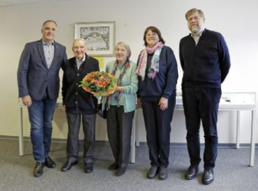Bürgermeister Alexander Immisch (links), der hauptamtliche Stadtarchivar Michael Kaminski (rechts) und Personalratsvorsitzende Gerlinde Ulbrich (2.v.r.) verabschiedeten Dieter Farnung (2.v.l.), der vor allem seiner Frau Gabriele (Mitte) dankte.Foto: Stadt Schwalbach