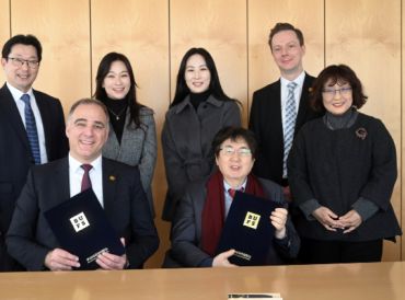 Bürgermeister Alexander Immisch und der Präsident der Busan University of Foreign Studies Jang Soon-heung (vorne) sowie (stehend, v.l.n.r.) Lee Deok-ju, Jo Minjeong, Kim Eunha, Philip Sokolowski und Song Hyun-jung nach der Unterzeichnung. Foto: Stadt Schwalbach