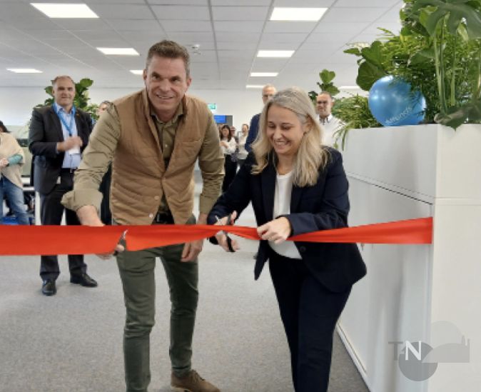 Attends-Geschäftsführerin Carla Fernandes und der Europa-Personalchef Stefan Hagström schnitten das rote Band zur Büro-Neueröffnung durch.Foto: Schlosser