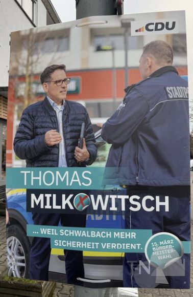 Schwalbach (MS). Seit dem Wochenende dürfen die Parteien Plakate zur Kommunal- und Bürgermeisterwahl am 15. März aufhängen. Kaum hängen die bunten Bilder, gibt es auch schon die erste Aufregung. Denn ausgerechnet CDU-Kandidat Thomas Milkowitsch – der als Erster Stadtrat ja eigentlich für Recht und Ordnung zuständig ist – hat mutmaßlich gleich gegen die Regeln verstoßen.
