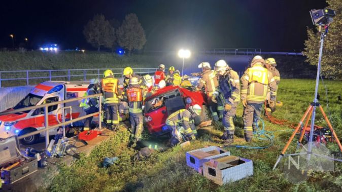 Nach einem Unfall an der Abfahrt zum Gewerbegebiet „Camp Phönix Park“ mussten Feuerwehrleute aus Schwalbach, Eschborn und Bad Soden mit schwerem Gerät einen VW Golf aufschneiden, um den schwerverletzten Fahrer bergen zu können.Foto: Feuerwehr Schwalbach