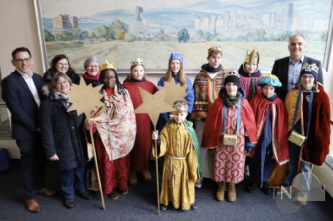 Schwalbach (sz). Auch in diesem Jahr besuchten die Sternsinger der Pfarrei Heilig Geist am Taunus das Schwalbacher Rathaus. In ihren Gewändern brachten Schwalbacher Kinder den traditionellen Segen. Bürgeremister Alexander Immisch und Erster Stadtrat Thomas Milkowitsch dankten den Kindern und Jugendlichen für deren Engagement. Sie hoben hervor, dass die Sternsinger trotz Schnee und Eis die Tradition fortgesetzt und ein Zeichen gegen Kinderarmut gesetzt hätten.