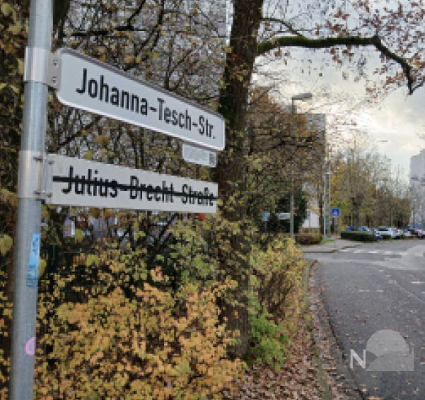 Seit Montag ist es offiziell: Die Julius-Brecht-Straße heißt jetzt Johanna-Tesch-Straße und der Rudolf-Dietz-Weg heißt Nelly-Sachs-Weg. Damit endet eine Diskussion, die bereits im Jahr 2019 mit einem Antrag der Grünen im Stadtparlament begonnen hat. Die alten Straßenschilder wurden durchgestrichen, sollen aber noch eine ganze Weile hängen bleiben, damit Briefe und Pakete ihre Empfänger erreichen. Unter die neuen Namen hat die Stadt kleine Hinweisschilder mit Informationen zu den Namensgeberinnen und den Grund der Umbenennung gehängt. Außerdem gibt es einen QR-Code, der zu weiteren Informationen auf der städtischen Internetseite führt. Die beiden Straßen wurden umbenannt, weil die bisherigen Namensgeber nach Auffassung der Mehrheit in der Stadtverordnetenversammlung Sympathisanten und Profiteure des NS-Regimes waren.Einen weiteren Bericht zu den neuen Namen lesen Sie auf Seite 5.Fotos: Schlosser
