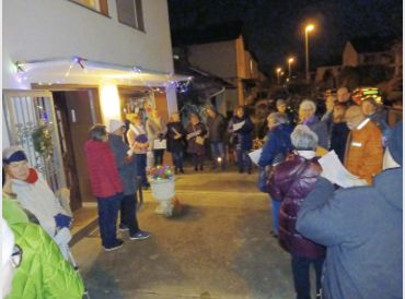 Am Dienstagabend fand der „Lebendige Adventskalender“ vor einem Haus in der Straße „Am Schollengarten“ statt, am vergangenen Freitag beim Seniorenbeirat im Foyer der Alten Schule in der Schulstraße (kleines Bild).Fotos: A. und M. Schlosser